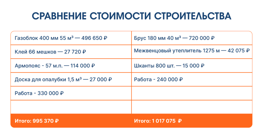 Резюме: Стена из бруса в два раза тоньше газобетонной при равной теплопроводности материалов, а значит - холоднее. Чтобы в деревянном доме было так же тепло, его придется “достраивать”: утеплять и закрывать фасадом. В итоге разница в 20 тысяч рублей в смете - это это лишь видимость равной цены. Выбирая газобетон, вы экономите 600–800 тысяч рублей, так как вам не нужно тратиться на дополнительное утепление и дополнительную отделку. Вы сразу получаете готовый теплый дом.