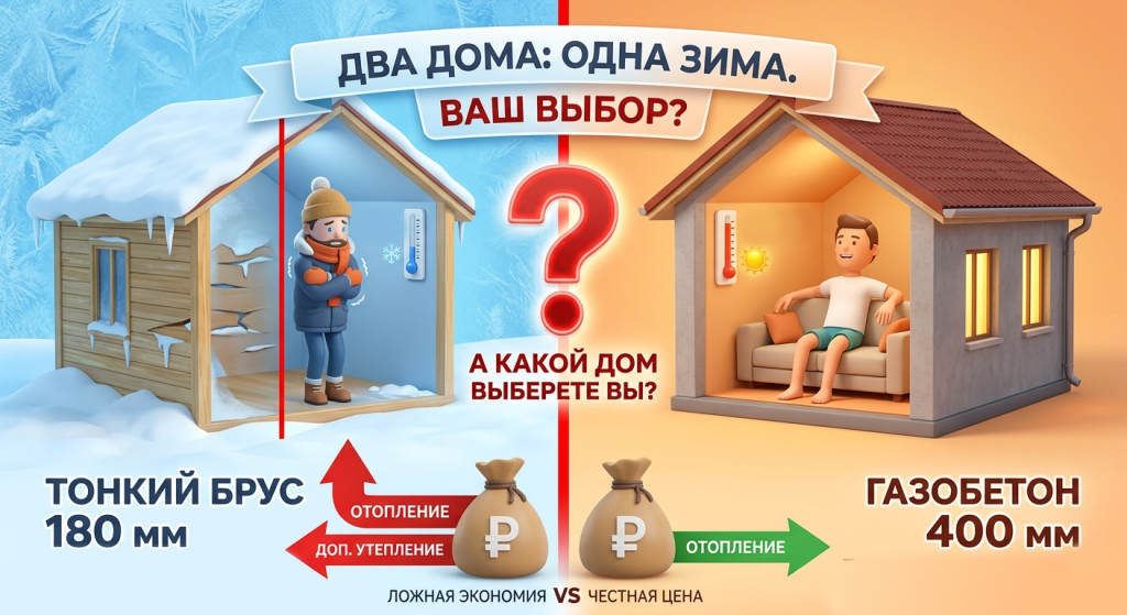 Дом из бруса - это классика, к которой многие привыкли. Однако важно понимать, что стандартный брус сечением 180 мм - это материал для сезонного или летнего проживания (а вы не знали?), либо требующий обязательного утепления для зимних условий. Без утепления дом будет терять тепло как минимум в 2 раза быстрее. Это значит, что каждый месяц ваш счет за отопление будет гораздо выше, чем у соседа в газобетонном доме. Жить, конечно, в нем будет можно, но помимо дома вы будете отапливать еще и улицу.